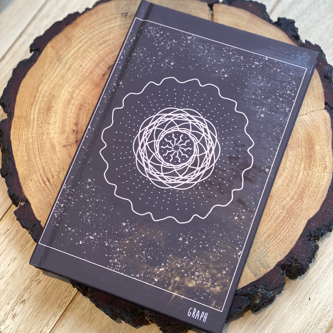 Let’s take a step into graphed time. This gorgeous noteboook is a graph notebook with a colour that makes sense – brown, grounding and stand out. The Mandala is drawn by me, Mandi, and is unique to the graph notebook. There is also a writing quote on the spine. Use this notebook anyway you would want.