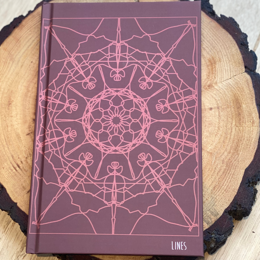 Let’s take a step into the standard. This gorgeous notboook is a lined notebook with a colour that makes sense – red, stunning, firey. The Mandala is drawn by me, Mandi, and is unique to the lined drawings. There is also a writing quote on the spine. This notebook can be used for your scribbles, stories, journaling and so much more.